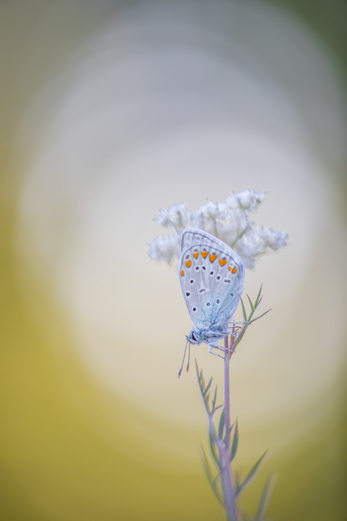 Ze verdedigen hun territorium vanuit vaste punten en achtervolgen allerlei vliegende insecten. Uit experimenten blijkt dat mannetjes vaker blauwe dan anders gekleurde vlinders benaderen en verjagen. Tijdens de balts vliegen mannetje en vrouwtje met een snelle vleugelslag en hangen secondenlang achter elkaar ´stil´ in de lucht. Wordt het paar niet verstoord door andere mannetjes, dan landen zij op of tussen de vegetatie. Het mannetje loopt dan achter het vrouwtje aan. Dit terwijl beide vlinders de vleugels op en neer bewegen. Hieruit volgt doorgaans de paring.