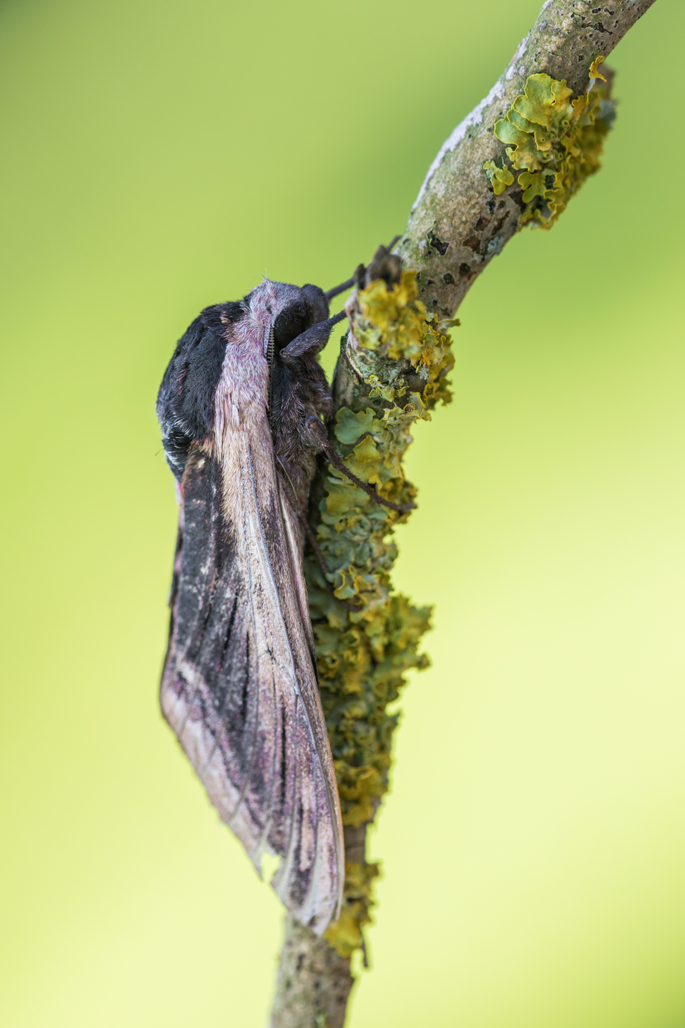 De rups is ongeveer ot 100 mm groot. Het lichaam is helder groen met op de flanken zeven schuine, witte, met purperafgezette strepen. Op het elfde segment een glimmend zwarte, scherp gepunte hoorn. De kop is geelachtig groen met twee brede zwarte strepen.
